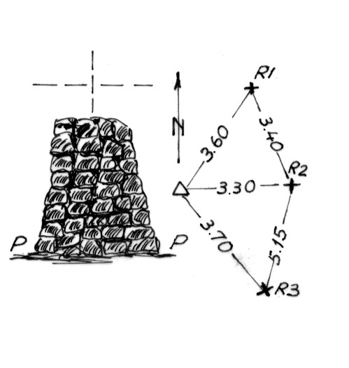 Segnale sulla cima del monte omonimo. Piccola piramide di pietre a secco. Riferimenti: tre croci incise su roccia.
