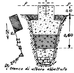 Segnale sulla prima altura nel costone di Mostarico, a sud di Albidona. Centrini di fondo e di superficie cementati in un blocco di calcestruzzo. Riferimenti: due come da pianta.