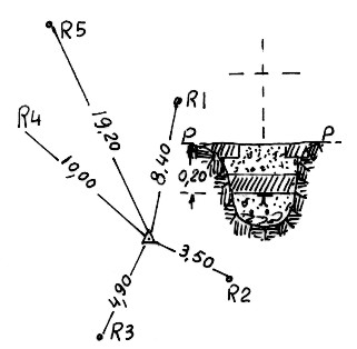 Segnale sull'altura rocciosa e tondeggiante a sud-est del Pizzo dell'Armi. Centrino di fondo. Riferimenti: (R1,R2,R3,R4) riferimenti su roccia (R5) croce incisa su roccia.