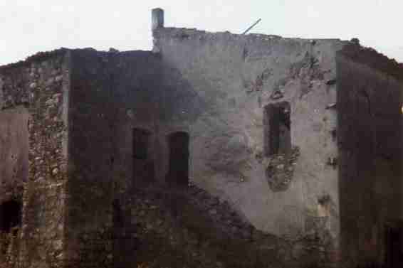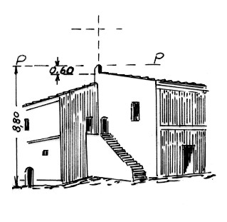 Segnale allo spigolo est, rientrato, del fabbricato sopra la scala di accesso al primo piano. Pilastrino. Asse geometrico del pilastrino. Segnalazione del 1987: l'edificio è in rovina.