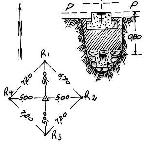 | Materializzazione | Segnale sull'estremità sud della regione pianeggiante, a circa 30 metri dalla mulattiera. Centrino di superficie e di fondo. Riferimenti: 4 centrini metallici come da pianta. |