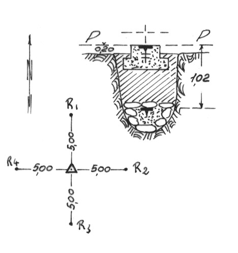 | Materializzazione | Segnale sul piccolo contrafforte che si eleva 200 metri a sud della casa colonica di Serro del Carro. Centrino di superficie e di fondo. Riferimenti: 4 centrini come da pianta. |