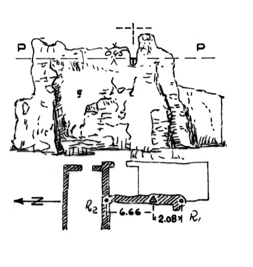 Segnale sul muro più alto dei ruderi della vecchia torre. Centrino di superficie. Riferimenti: due come da pianta.