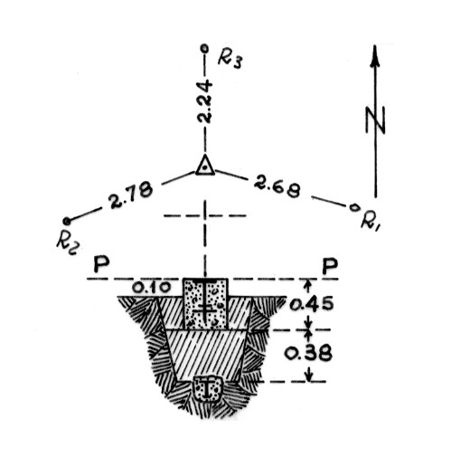Segnale sul cocuzzolo sito a cinquanta metri ad ovest della casa omonima. Centrini di superficie e di fondo. Riferimenti: tre come da pianta.