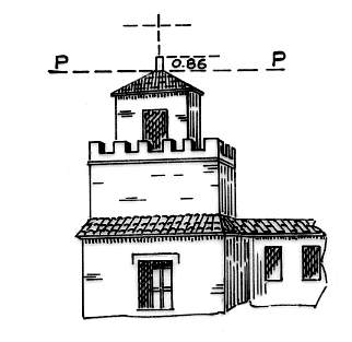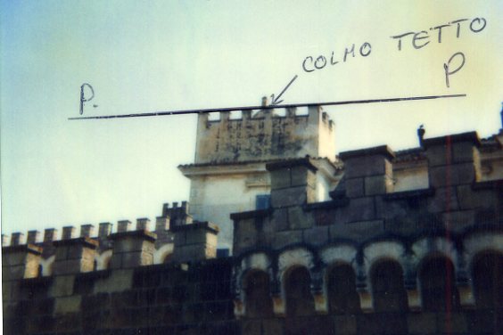 | Materializzazione | Segnale sul colmo tetto della loggetta della villa omonima. Pilastrino di mattoni con centrino di fondo annegato a ventotto centimetri dalla sommità. Asse geometrico del pilastrino. |