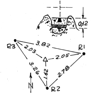 Segnale sul punto più elevato del monte. Centrino di fondo cementato in una cavità della roccia e soprastante centrino tronco conico di zinco. Riferimenti: 3 centrini metallici.
