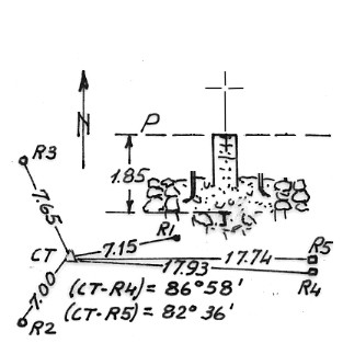 | Materializzazione | Segnale sul monte. Centrino di fondo cementato al centro di una croce incisa su roccia e sovrastante pilastrino in cemento con centrino alla sommità. Riferimenti: tre centrini metallici (R1, R2, R3) due pilastrini in muratura con centrini alla base ed alla sommità (R4, R5). |