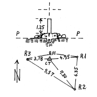 Segnale costituito da pilastrino in mattoni con centrino alla base e centrino di fondo cementato al centro dell'antica croce incisa su roccia. Asse geometrico del pilastrino. Riferimenti: tre centrini cementati su roccia.