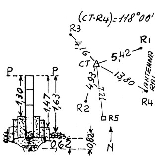 | Materializzazione | Segnale sulla cima del monte in prossimità di un' antenna TV del Centro RAI- TV di M. Cammarata. Centrini di fondo e di superficie con sovrastanti pilastri-no e mira ambedue in ferro. Riferimenti: R1,R2,R3 centrini metallici; R4 asse geometrico dell' antenna TV material. da un centrino cementato alla base, R5 piccolo pilastrino in muratura.Coordinate: R4:n=4 164 507,38 E=2 397 109,00. |