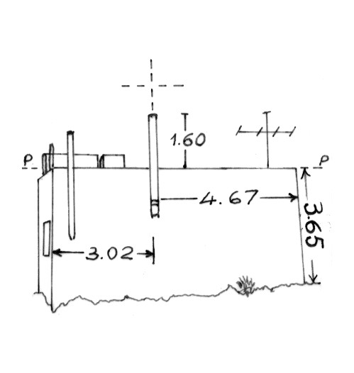 | Materializzazione | Canna fumaria cilindrica posta in posizione pressoché centrale del muro nord della casa. Asse geometrico della canna fumaria. Riferimenti:spigoli Nord-Est e Nord-Ovest della casa. |