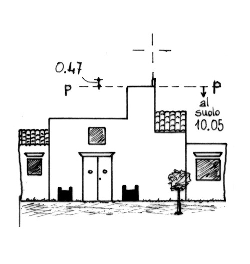 | Materializzazione | Pilastrino di tufo sullo spigolo nord del copriscala che da accesso alla terrazza più alta dell'edificio. Asse geometrico del pilastrino. |