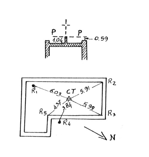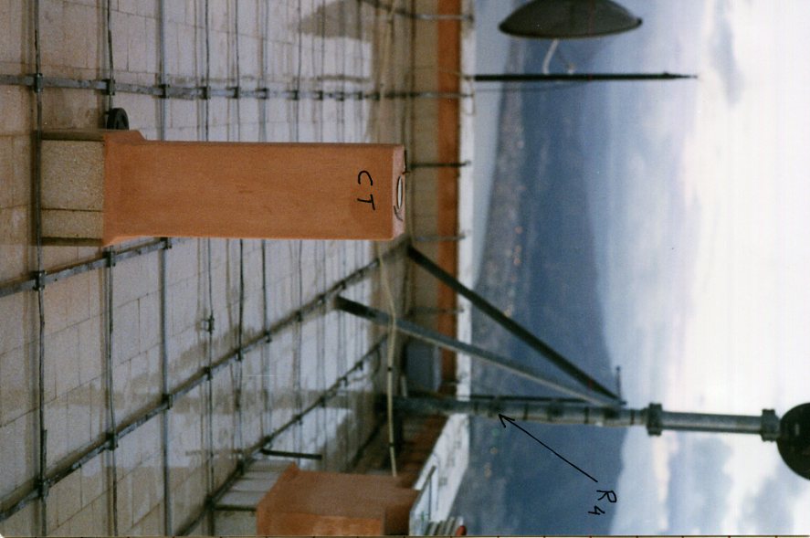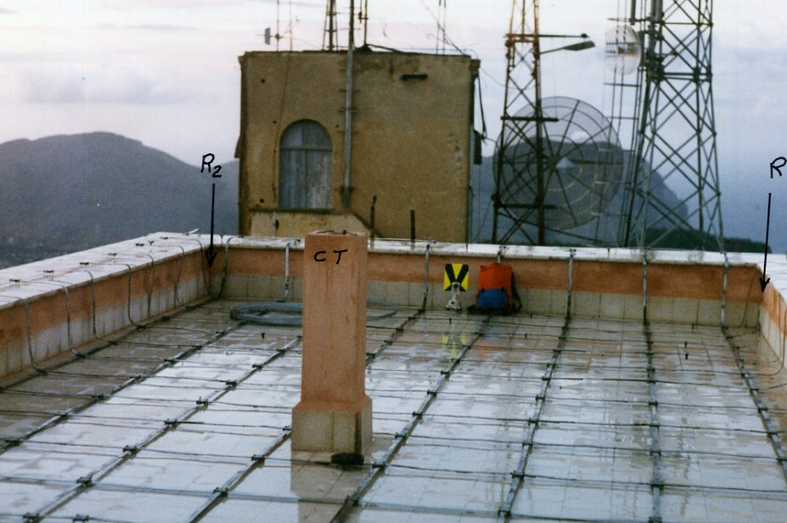 Pilastrino in cemento armato a sezione quadrata con centrino di superficie alla sommità, eretto sulla copertura a terrazza dell'edificio contenente gli apparati del ripetitore usato dai carabinieri. Riferimenti: R1 palo, R2, R3 spigolo edificio.