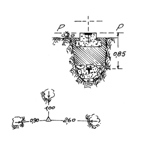 | Materializzazione | Segnale sul cocuzzolo roccioso a nord di Palizzi Marina. Centrino di fondo e di superficie. Riferimenti: tre freccie scolpite su rocce circostanti. |