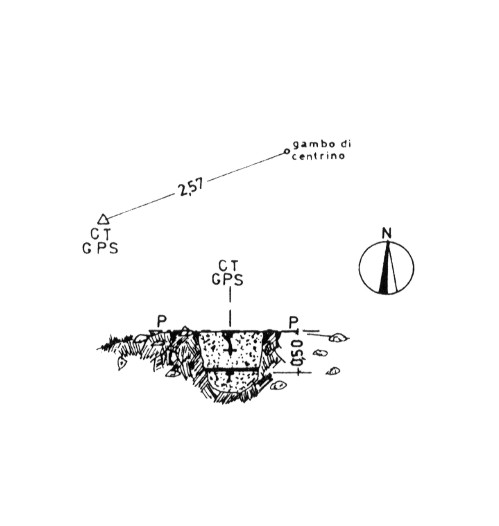 | Materializzazione | Segnale sul monte. Centrini di fondo e di superficie in un blocco di calcestruzzo. Riferimenti: tre centrini. |