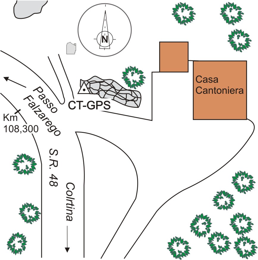 | materializzazione | Centrino Universale IGM infisso su roccia affiorante nei pressi dell'accesso all'ex Bar-Ristorante, al n° civico 1, ed a 7,9 m dal palo destro del cancello che dà accesso al Parco Naturale delle Dolomiti Ampezzane. |