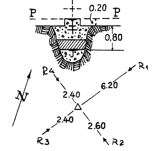 Segnale sull'altura a sud-est di Bruzzano. Centrini di superficie e di fondo. Riferimenti: 4 frecce.