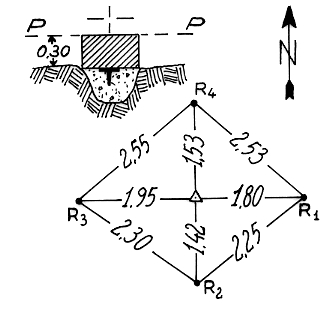 Segnale sulla vetta del monte. Piccolo pilastrino con sottostante centrino posto quasi al livello del suolo. Riferimenti: quattro come da pianta.