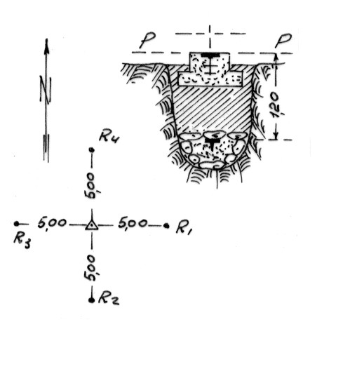 Segnale sull'altura a nord-est di Scido. Centrino di superficie e di fondo. Riferimenti: 4 centrini affioranti da pozzetti di calcestruzzo.