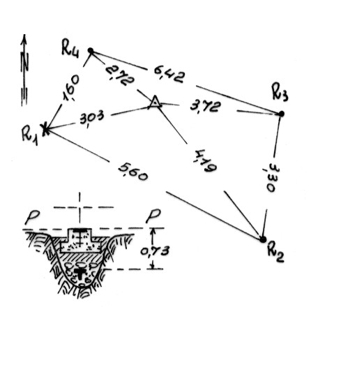 | Materializzazione | Segnale sulla parte più alta del Puntone Trapezi nei pressi della rotabile che porta a Gambarie. Centrino di fondo e di superficie. Riferimenti: R1 croce incisa su roccia; R2, R3, R4, centrini. |