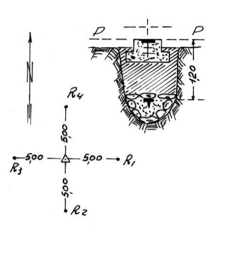 Segnale su di un'altura nei Piani di Aspromonte sulla destra della rotabile Gambarie-Delianuova. Centrino di fondo e di superficie. Riferimenti: 4 centrini annegati nel calcestruzzo.