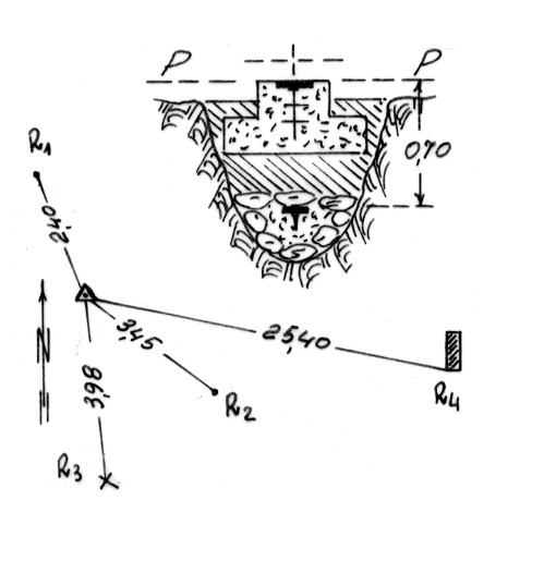 Segnale presso la cabina dell'acquedotto 40 metri a destra della strada Villa San Giovanni-Melvia. Centrino di fondo e di superficie. Riferimenti: R1, R2 centrini; R3 croce incisa su roccia; R4 pilastrino.