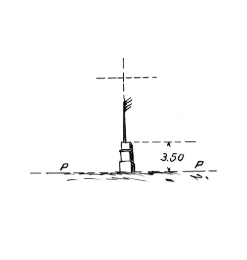 Basamento in muratura del palo del telegrafo sul letto del torrente Noceto, presso la sua foce. Asse geometrico del basamento.