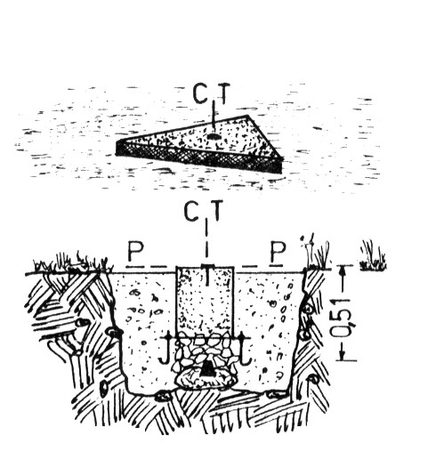 | Materializzazione | Centrino di zinco tronco conico alloggiato nel centro di una pietra sulla quale è stata incisa una croce, sormontato coassialmente da un elemento di pilastrino metallico a sezione triangolare affiorante dal suolo sulla sommità del quale è stato cementato, coassialmente, un centrino in acciaio inox tipo "GPS C" |