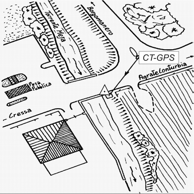 | materializzazione | Centrino metallico infisso al centro del blocco in calcestruzzo adiacente alla spalla del ponte sul torrente Meja. |