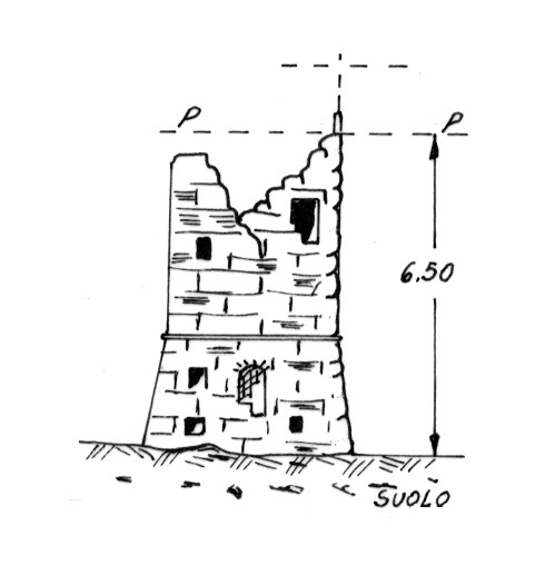 | Materializzazione | Segnale, costituito da pilastrino, sopra uno dei merli d'angolo della torre diruta. Asse geometrico del pilastrino. |