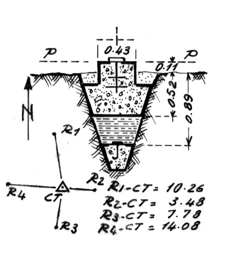 | Materializzazione | Segnale sul crinale del bosco, situato sopra un cocuzzolo detto "Gran Petto". Centrini di fondo e di superficie in blocco di calcestruzzo. Riferimenti: come da pianta. |
