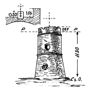 | Materializzazione | Torre sulle pendici della collina. Asse geometrico della torre, materializzato da un pilastrino in calcestruzzo, con centrino di superficie alla sommità, posto sulla volta superiore della torre. |