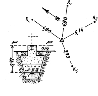 Segnale sulla sommità dell'altura. Centrini di fondo e di superficie, cementati in blocco di calcestruzzo, sporgente dal terreno. Riferimenti:quattro centrini con freccia.