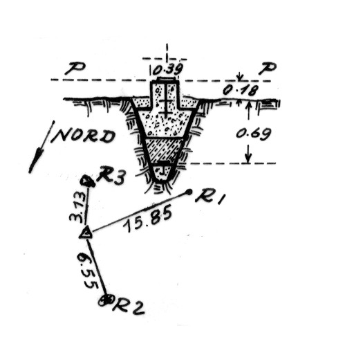 Segnale sull'estremità del contrafforte che divide la fiumara di Turbolo da quella di Gioiosa, ad ovest di Gioiosa Jonica. Centrini di fondo e di superficie in blocco di calcestruzzo. Riferimenti: Due pietre (R2 – R3) con croce ed una croce (R1) su tronco d'ulivo.