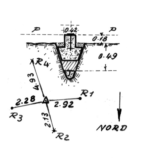 Segnale sopra uno dei cocuzzoli del crinale che discende su Martona. Centrini di superficie e di fondo in blocco di calcestruzzo. Riferimenti: Due centrini con freccia (R1 – R3) due croci su pietra (R2 – R4).