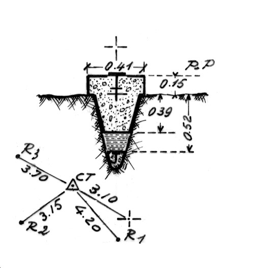 | Materializzazione | Segnale sul cocuzzolo. Centrini di fondo e di superficie in blocco di calcestruzzo. Riferimenti: Tre centrini con freccia (R2 – R3) ed una croce (punto catastale) (R1). |