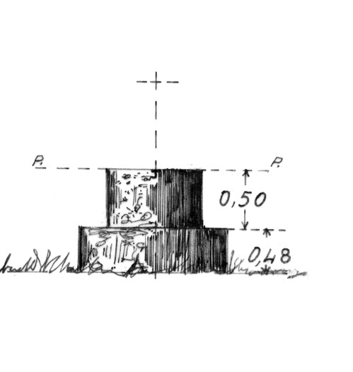 Segnale sull'estremità Nord dell'orto retrostante la chiesa di S. Maria Dell'isola sulla sommità di un promontorio roccioso. Pilastrino con basamento e centrino di superficie. Asse geometrico del pilastrino.