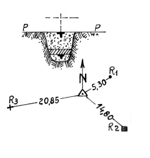 | Materializzazione | Segnale sull'altura. Centrini di superficie e di fondo. Riferimenti: R1 centrino; R2 spigolo Nord-Ovest capanna; R3 croce incisa su grosso masso sporgente. |