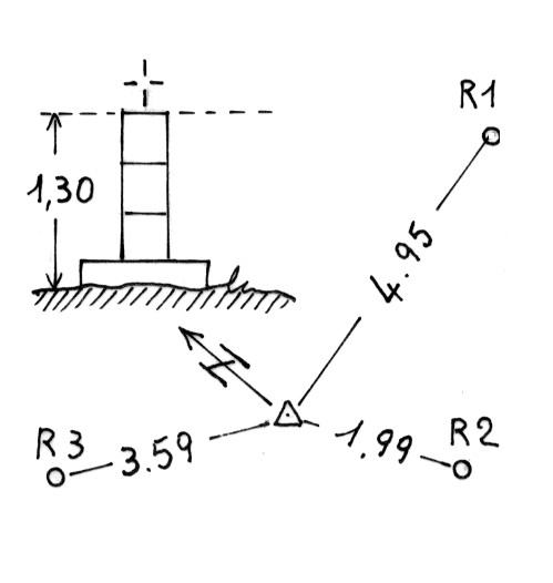 Segnale sulla cima boscosa del monte. Pilastrino triangolare in ferro con sottostanti centrini coassiali di cui il più basso cementato a metri 1 di profondità. Riferimenti: 3 centrini metallici come da pianta.