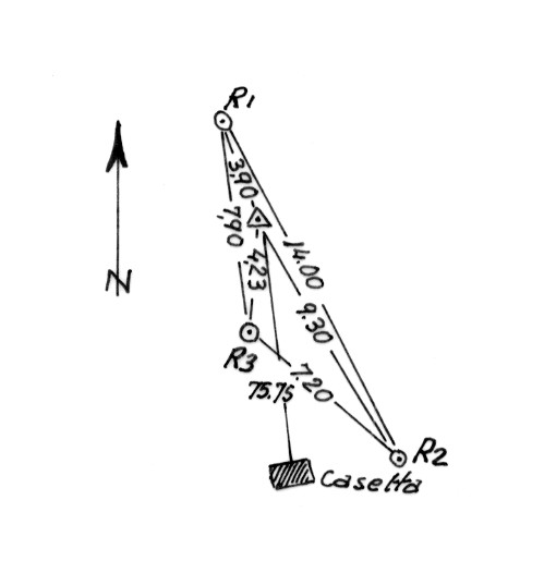| Materializzazione | Segnale sul margine Nord-ovest del Pianoro. Centrino di fondo e di superficie, cementati in blocco di calcestruzzo. Riferimenti: 3 come da pianta. |