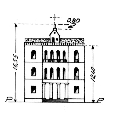 Segnale sul colmo del tetto più alto del Sanatorio "S. Giovanni Bosco" sul frontone lato terrazza. Centrino tronco conico con soprastante pilastrino in cemento. Asse geometrico del pilastrino.