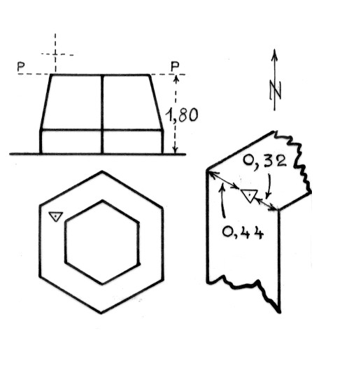 Segnale sulla sommità del manufatto in cemento a pianta esagonale (ex postazione di artiglieria), situato sulla parte più elevata della collina. Centrino metallico cementato presso lo spigolo nord ovest.