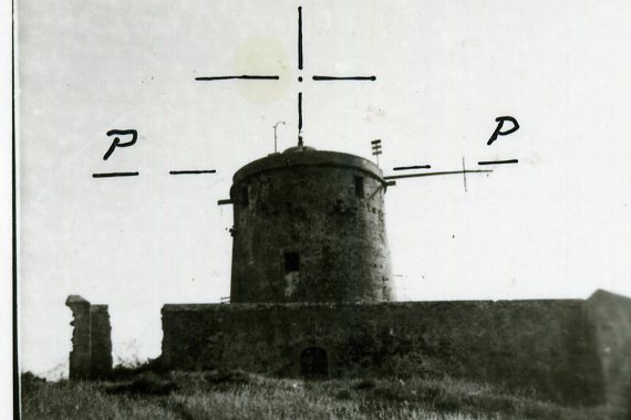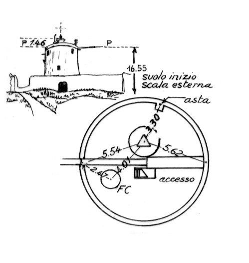Sulla torre omonima sita nel punto più alto di Capo di Pula. Asse della lanterna posta alla sommità e in asse al casotto cilindrico esistente. Misure orizzontali a particolari costruttivi della terrazza, come riferimenti.
