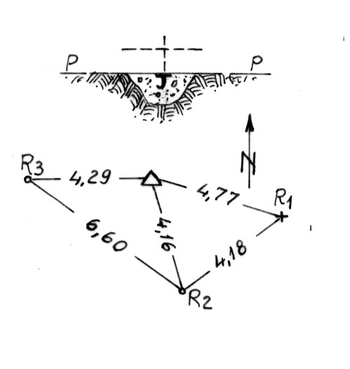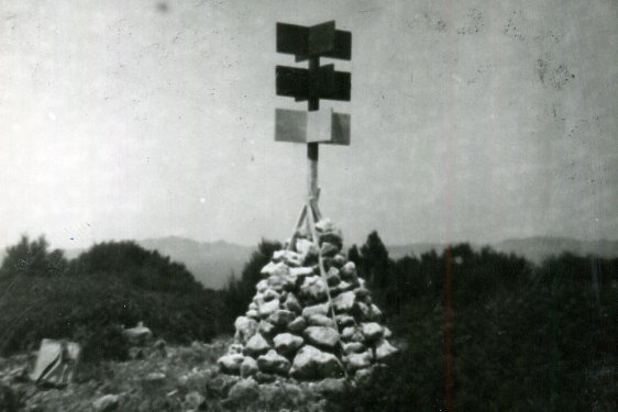 Segnale sulla sommità dell'altura omonima. Centrino di profondità cementato in superficie. Riferimenti: R1 croce incisa su roccia; R2, R3 centrini.