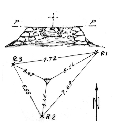 Segnale al centro del nuraghe situato sulla collina. Croce incisa su pietra interrata. Riferimenti: tre croci incise sui pietroni del nuraghe.