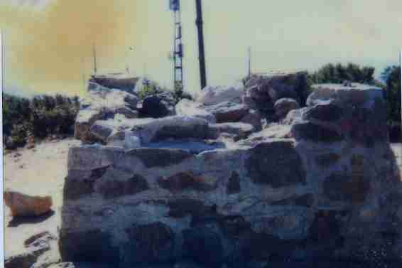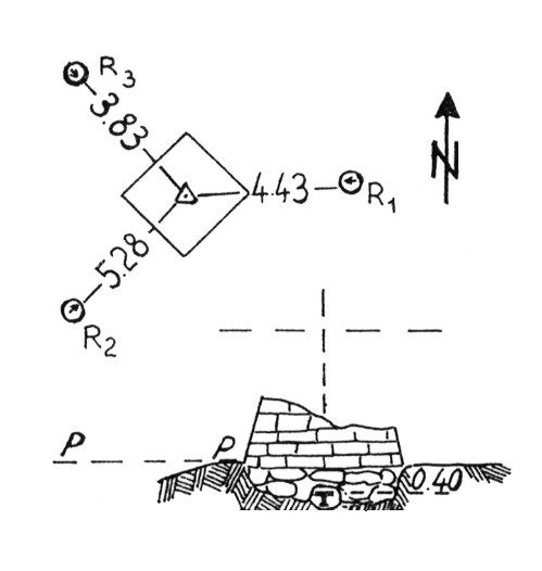 Segnale sulla cima di mezzo, che è la più alta, delle tre che costituiscono il massiccio del monte. Ruderi del basamento tronco piramidale. Asse geometrico dei ruderi. Riferimenti:come da pianta.