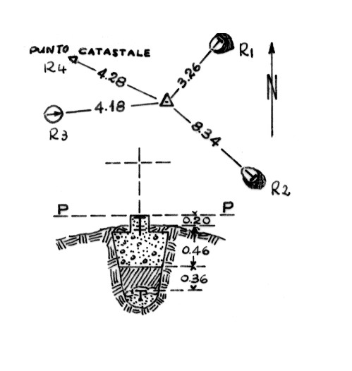 Segnale sulla sommità del cocuzzolo sul contrafforte che divide le vallate del Craticello e del Fiumicello. Centrini di superficie e di fondo. Riferimento: Quattro come da pianta.