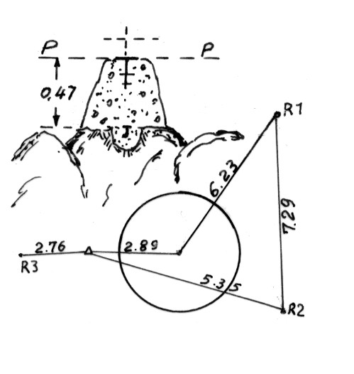 Segnale su una roccia della cresta chiamata Terra del Fuoco. Centrino di superficie e sottostante centrino di fondo cementato in un foro ricavato nella roccia. Riferimenti: come da pianta.