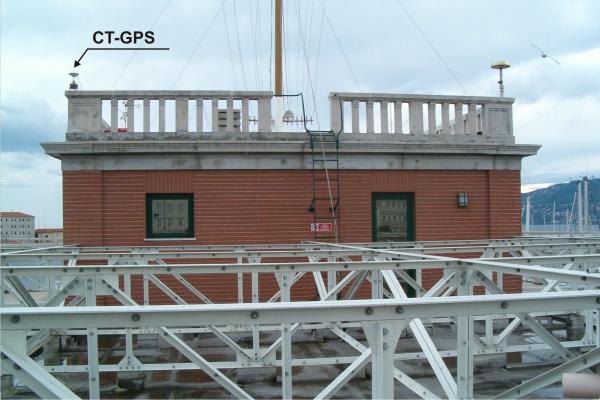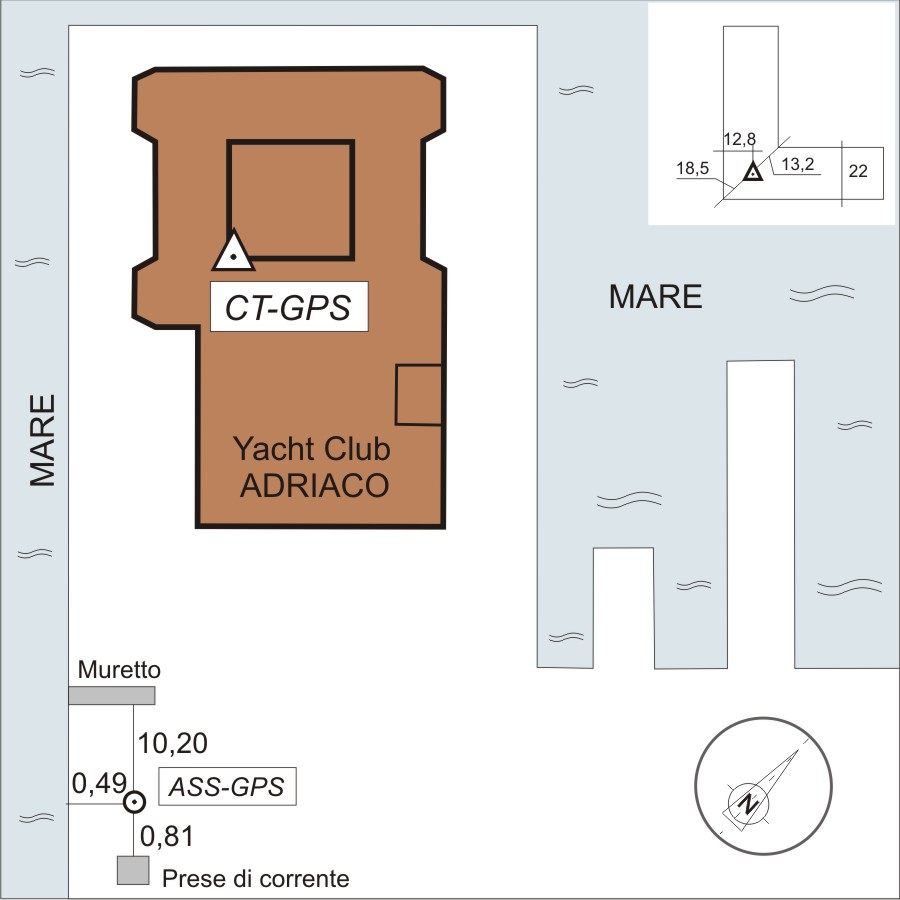 Centrino in acciaio inox del tipo "GPS C" infisso sullo spigolo del parapetto della torretta quadrata dell'edificio in cui ha sede lo Yacht Club "Adriaco".
