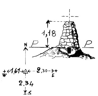 Segnale su un grosso sasso recante incise le lettere C. S. posto su un cocuzzolo del contrafforte che separa il torrente Strona dal torrente Bagnola. Centrino cementato e coassiale pilastrino in pietrame a secco. Tre riferimenti come da pianta.
