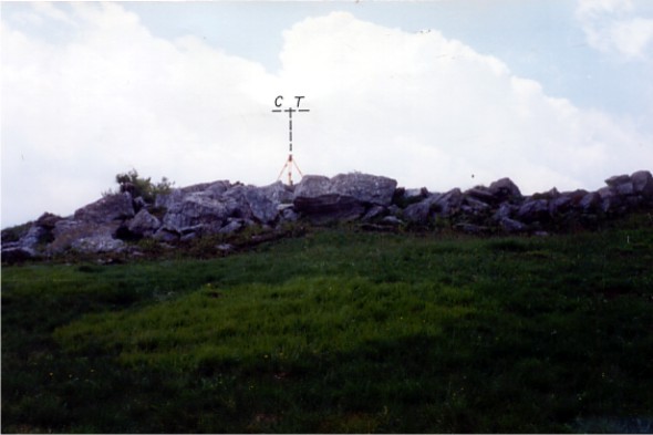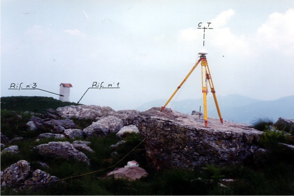 Segnale sulla cima del monte omonimo, chiodo in acciaio inox cementato su roccia. Riferimenti: R1, R2 centrini metallici, R3 croce incisa su roccia.